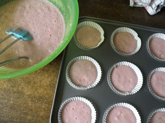 Pour the wet mix into the dry mix and gently stir until combined. Spoon/pour (mine was quite liquid-like) into cupcake cases almost to the top. Bake for about 20 minutes or until slightly browned. Leave to cool completely before frosting.