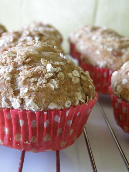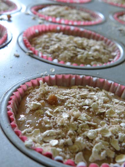Mix topping ingredients in a small bowl and sprinkle a little onto the uncooked muffins. Place into the oven and cook until brown and risen. About 10/15 minutes. The smell that wafts from your oven is banana gorgeousness!