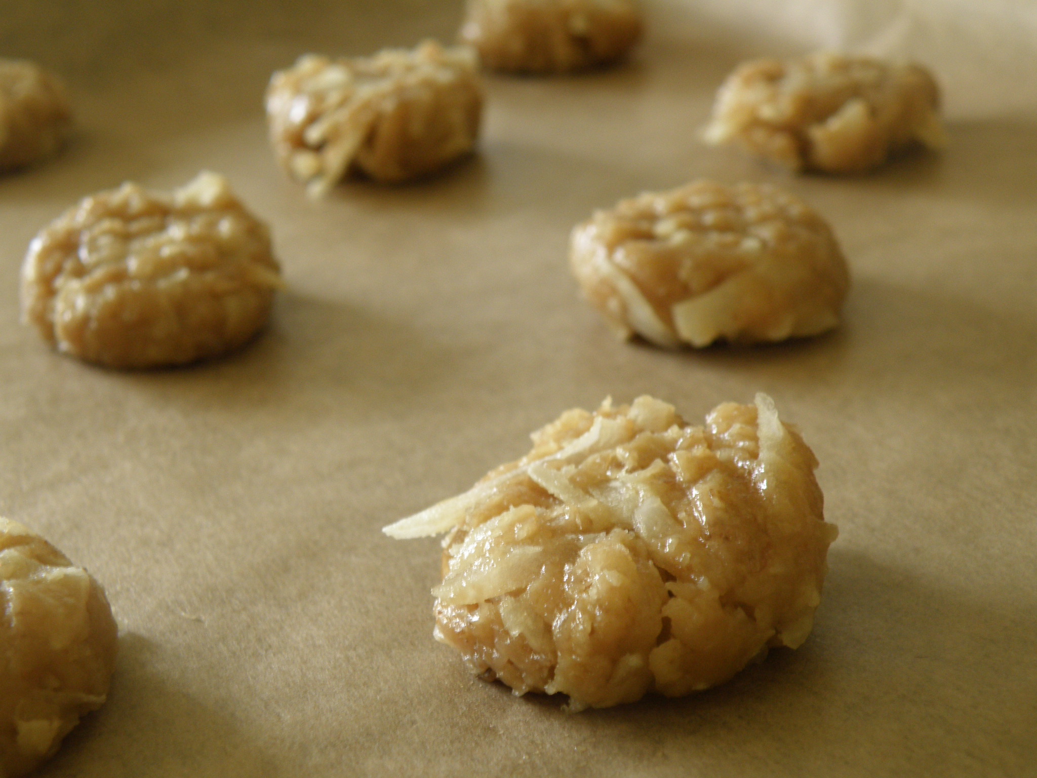The problem I encountered however was finding dried (or desiccated) coconut that did not have a “may contain nuts” sign on the packaging. Eventually I decided that it really couldn’t be that difficult to make so bought a whole coconut and went about making some myself. For anyone else facing similar problems I will add the “recipe” for that at the bottom, below is the recipe for the ANZAC Biscuits. The recipe is adapted from a Bill Granger recipe I found online and the cookies were really delicious, my only regret is that I didn’t have any Golden Syrup at the time so used a Belgian syrup, although I think it worked rather well I will definitely try them again with Lyles Golden “Gold”. Also I decided to make my coconut quite big in comparison to “normal” desiccated coconut you get in a bag. More “rustic” let’s say.