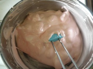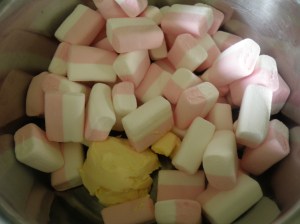 This is really a very simple recipe, but you must make sure to constantly stir the marshmallow until it has melted otherwise it will stick to the bottom and burn. So stir stir away!