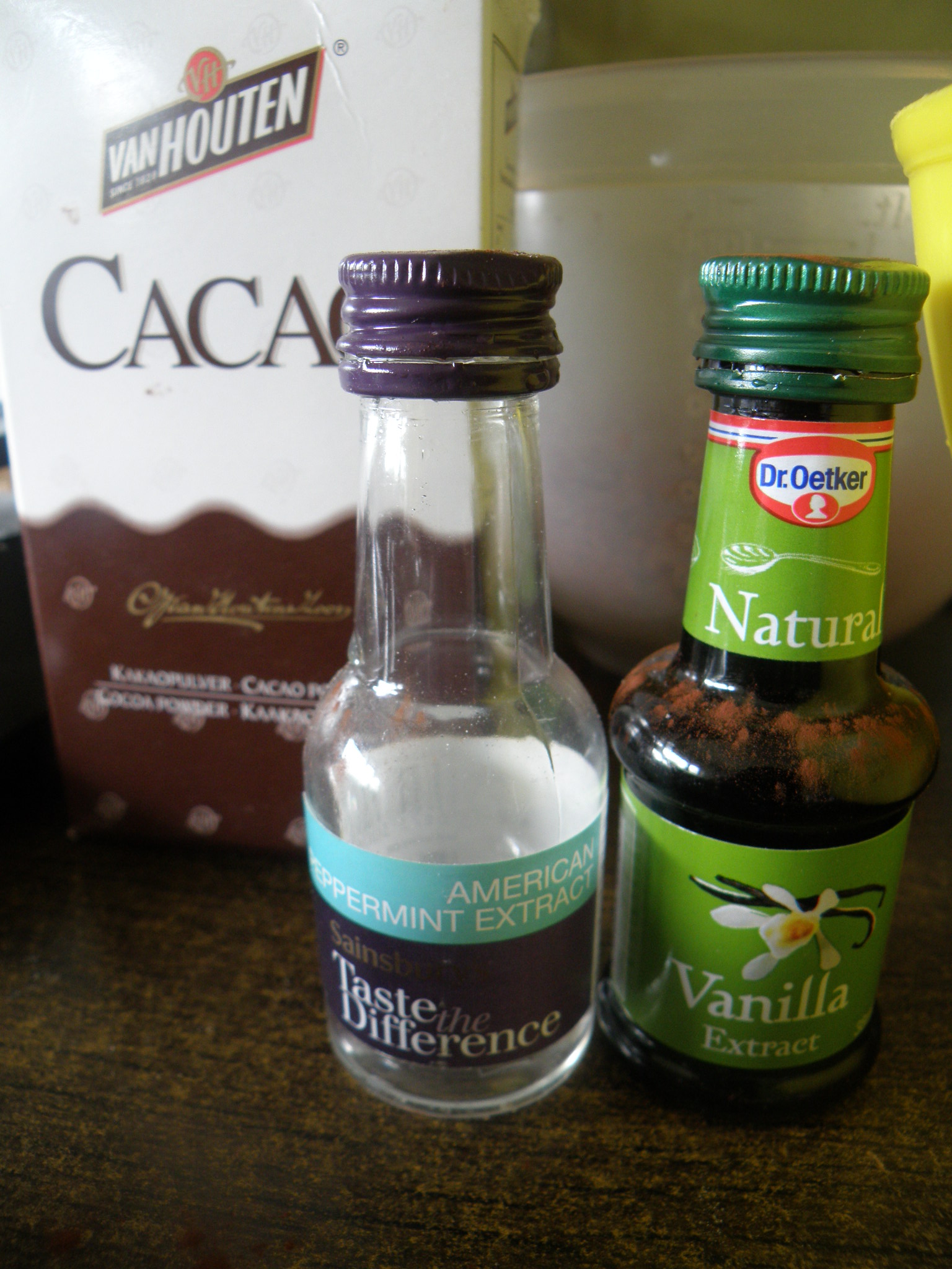 When completely melted, add the vanilla, mint and cocoa, stir until smooth.