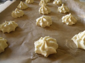 Using a piping bag, pipe stars of approximately 1¼ inch (3cm) diameter and no more than 1/8th inch (6mm) high onto baking paper on a baking tray.