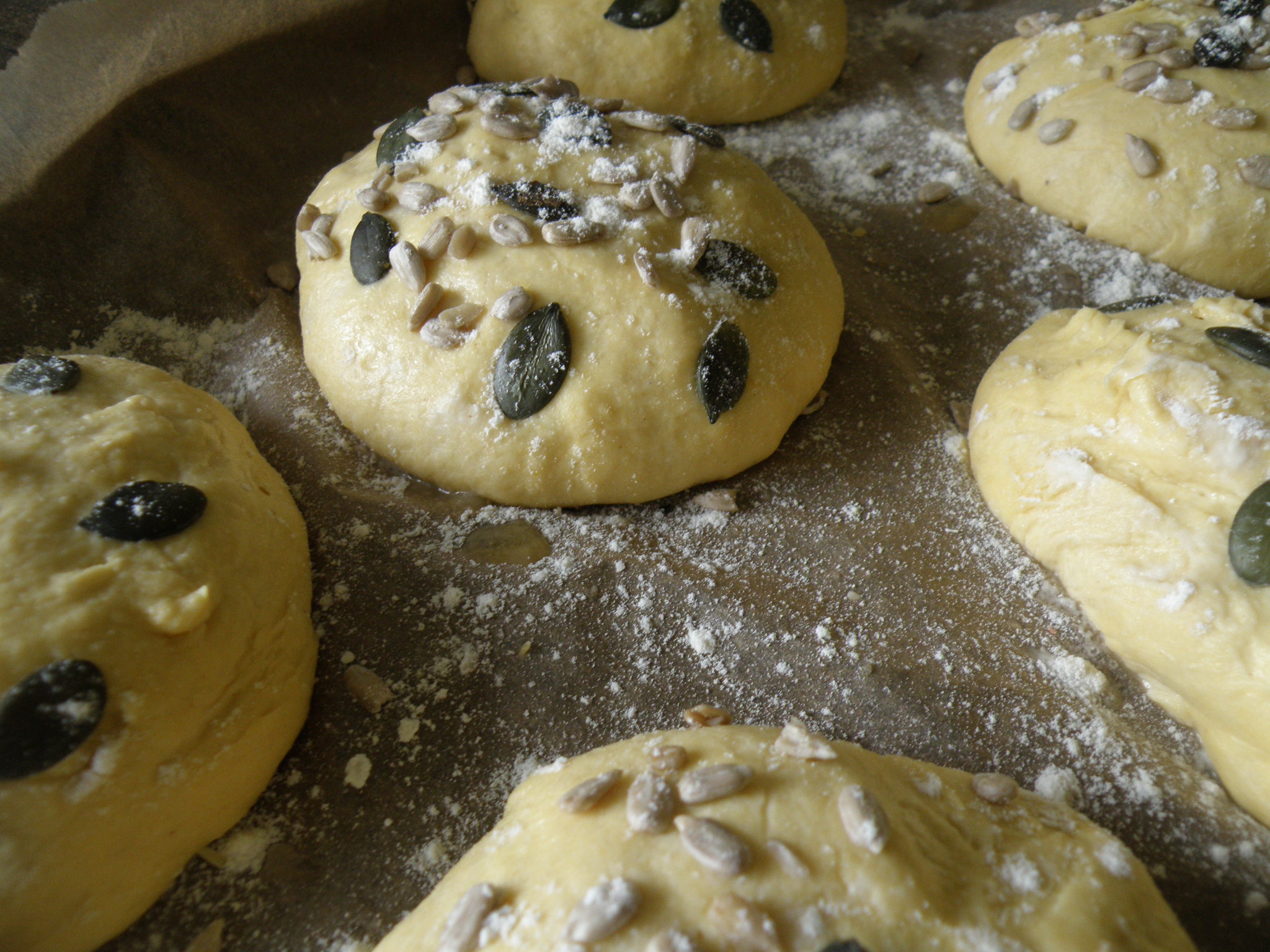 7. Once doubled in size turn out of the bowl and knead for a minute or so. Next half the dough and either make into two loaves or (as I did) one loaf and nine to twelve rolls. Put onto greased/ baking paper lined trays, over with oiled clingfilm and leave for another 30-45 minutes. Preheat the oven at 170 c.