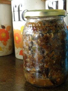 4. The next day spoon into sterilized jars. Push as much in the jar as you can then (optional) pour a tbsp of alcohol over the top, seal and store somewhere cool and dark.