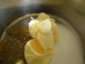 Melt the butter, sugar and marmalade together in a pan over a low heat. Stir with a wooden spoon.