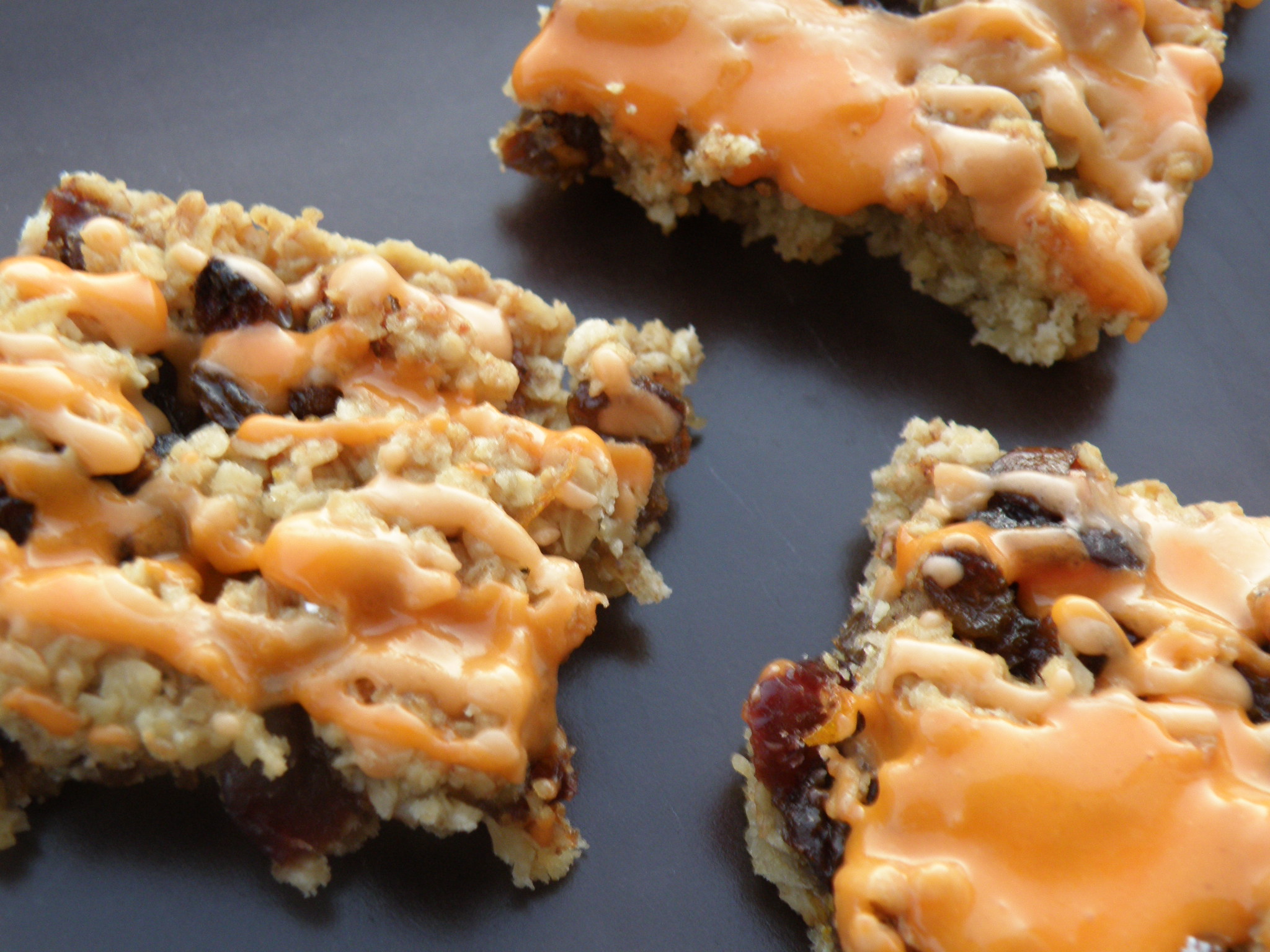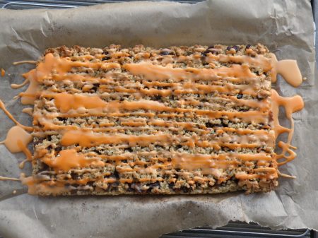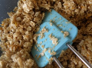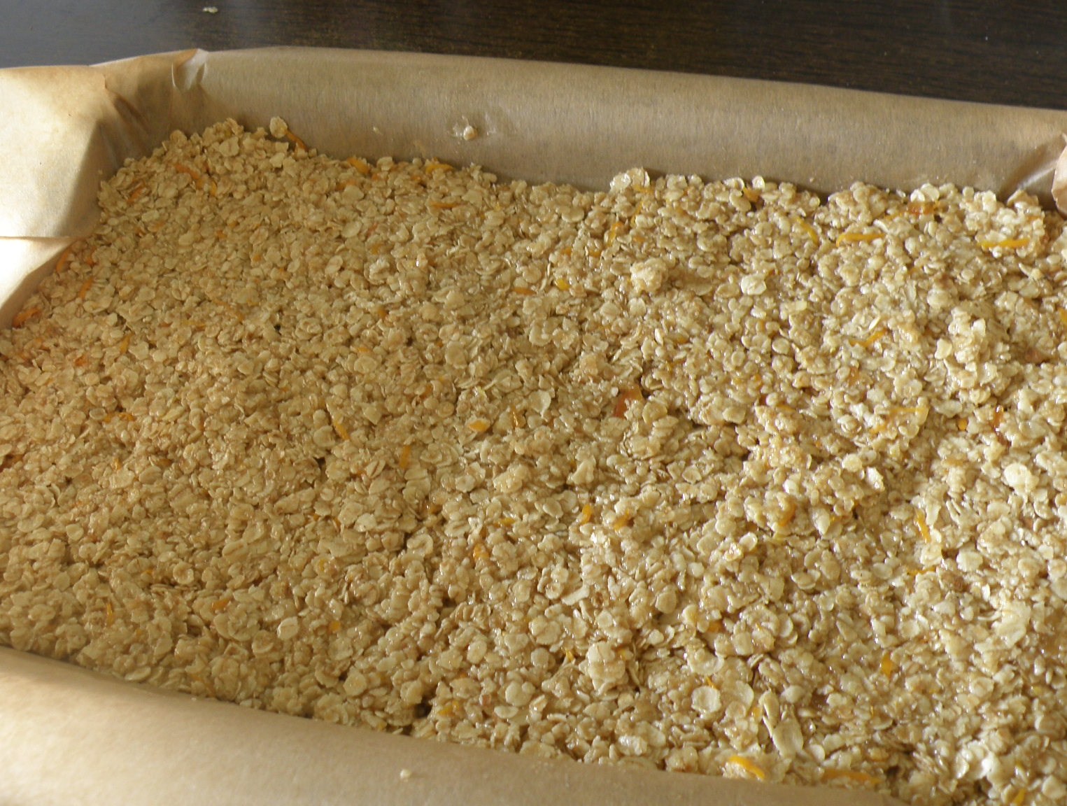 Add the melted mixture to the oats and mix to combine. Press about 2/3 of the mixture into a 20 x 30 cm pan and press down with a spatula.
