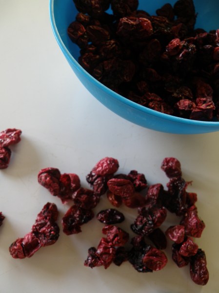 I was getting pretty annoyed with the price of dried cranberries here. Also the fact that when I did find them at a reasonable price they seem to always have a “may contain nuts” sign on the package. So I decided to buy fresh and attempt to dry them myself. I used a 12 oz bag (about 340g) and that gave me 40g dried fruit. It is enough for my recipe but I would definitely make double next time.