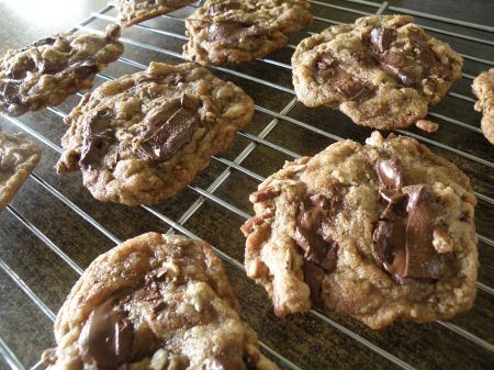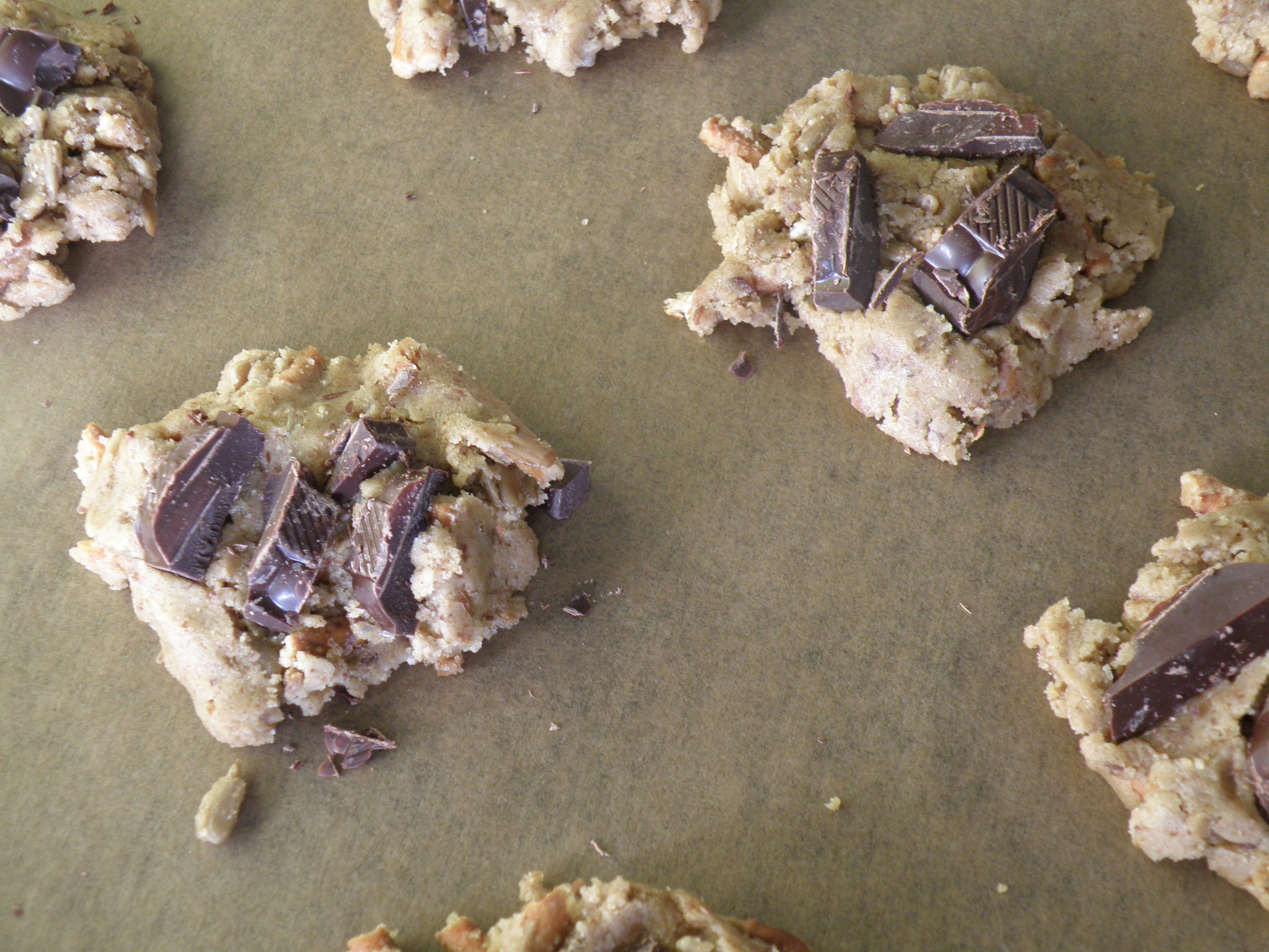 When I happen upon food my three-year old allergy boy can eat my first thought is usually ” ooh I wonder how I can bake this in something”. So, these have it all (as far as I am concerned) they are nutty, salty, sweet, chewy and crunchy. Yummo. I also made a chocolate chunk version much to the delight of my older son who kept on asking for “one more” again and again.