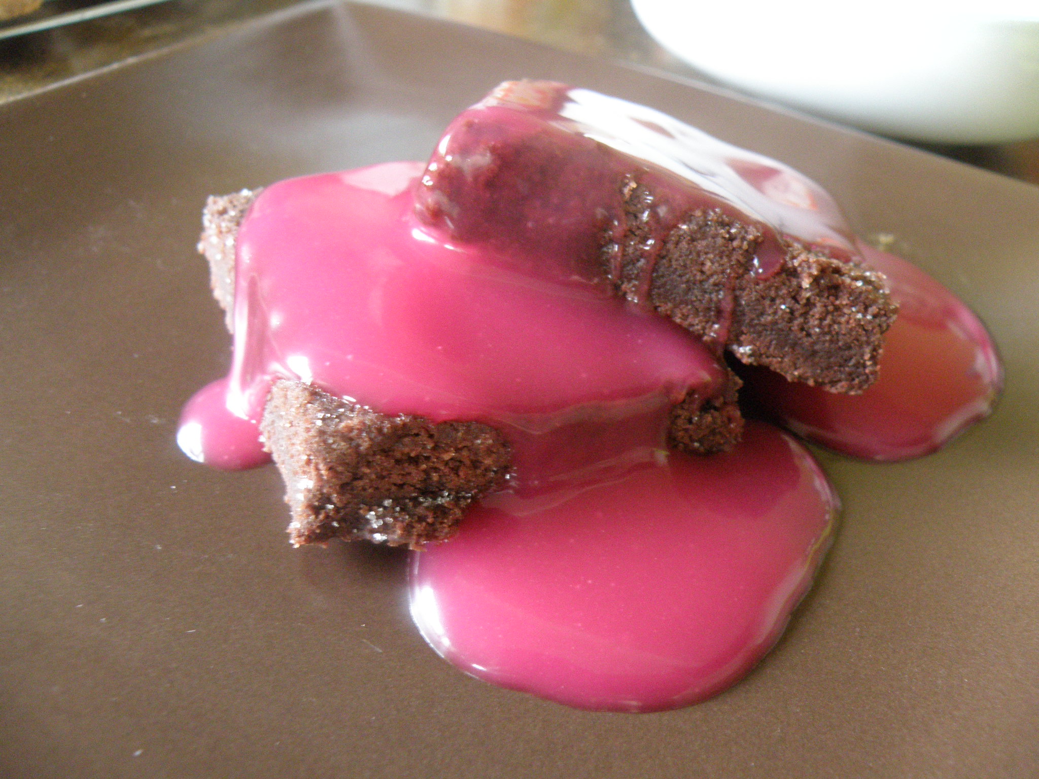 Pour the rest of the milk into a saucepan and gently heat until hot but not boiling. Once hot pour into the pink paste, whisk to combine and pour everything back into the saucepan. Now you need to keep stirring with the whisk until the mixture just comes to boil and thickens to a nice custard consistency, this won’t take long. Once thickened remove from heat and pour over your Chocolate Concrete. Yum.