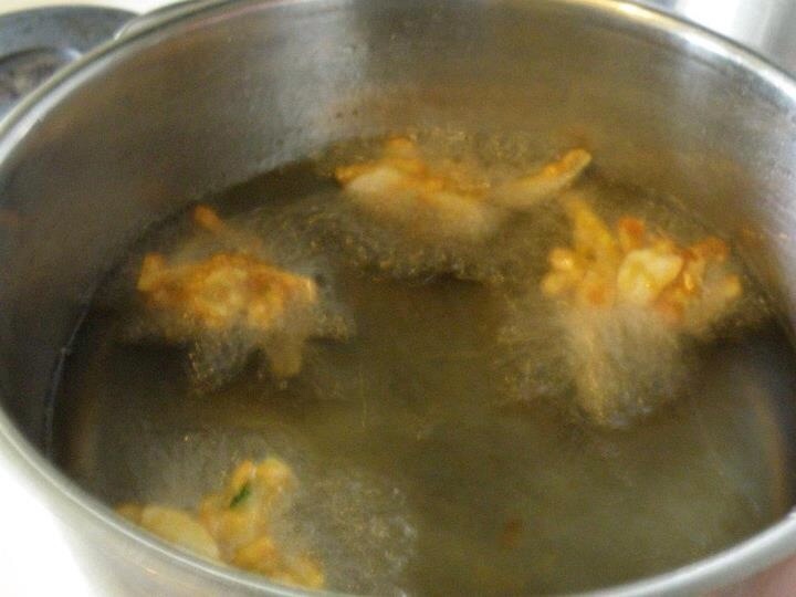 2. Heat the sunflower oil in a saucepan or wok, you need 2 or 3 inches deep at least. Once you think the oil is hot enough test a little bit of onion, if it sizzles straight away you are ready to go!