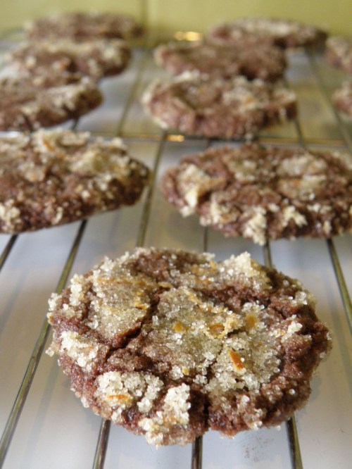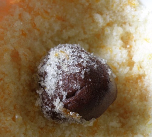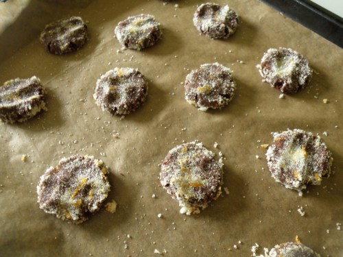 I really love those chocolate crinkle cookies with the icing sugar coating that cracks when baking so i sort of went with a variation on that theme. I mixed orange zest with sugar to make a scented sugar that I hoped would result in a crunchy coating once baked.