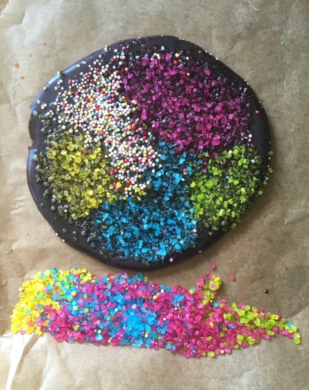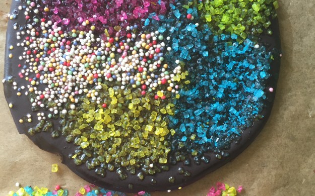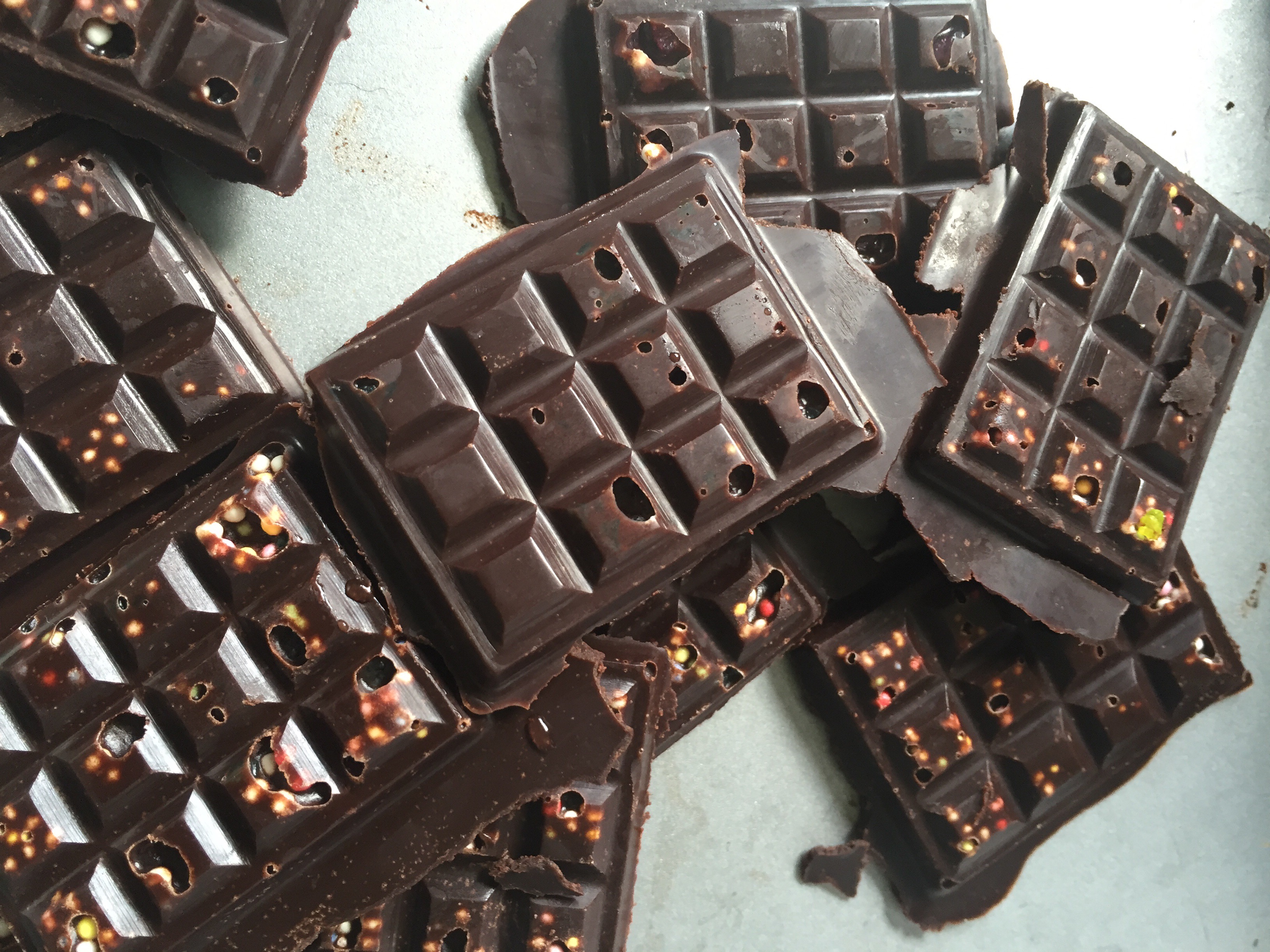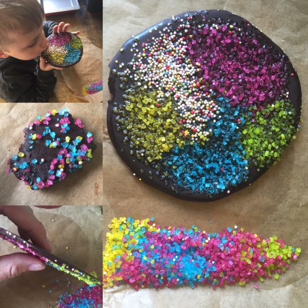 2. Add the cocoa and gently melt over a pan with water. Add optional flavour before pouring into moulds or spreading on greaseproof paper. Now is the time to embellish with your chosen decorations.